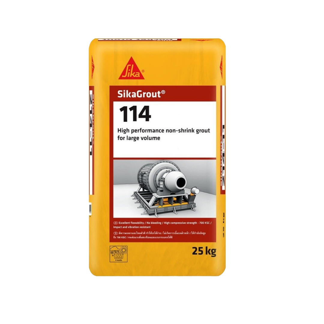 SikaGrout 114 is a high-performance, cementitious, non-shrink grout designed for precision applications. This free-flowing grout is ideal for filling gaps under base plates, anchoring bolts, and machine foundations. It provides excellent compressive strength, achieving up to 65 MPa after 28 days, making it suitable for projects requiring durability and precision. Its formulation ensures dual expansion, helping to mitigate shrinkage, and it offers excellent flow characteristics for easy application in confined spaces.
